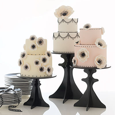 Трудна работа ще е да се сдобия с подобни поставки, но предполагам, че изчистената глазура няма да представлява трудност за сладкарите. Иииии - естествена цветя върху торта.... не е ли малко странно? Искам точно тези черно-бели анемонии!