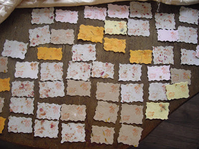 Направих 50 етикетчета от ръчна хартия в различен цвят и им отпечатах калинки и ангелчета с гумени печати и мастило.