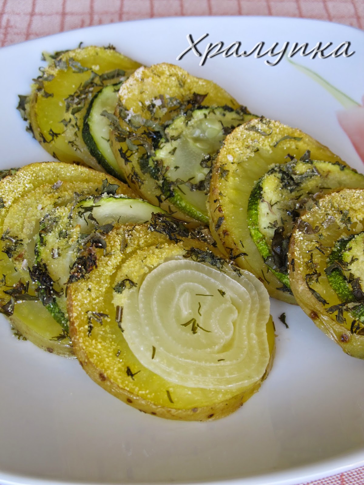 И понеже е обяд вече, черпя ви с моя обяд - картофи и тиквички на фурна (моите са с по малко подправки, за да са съобразени с диетата ми )